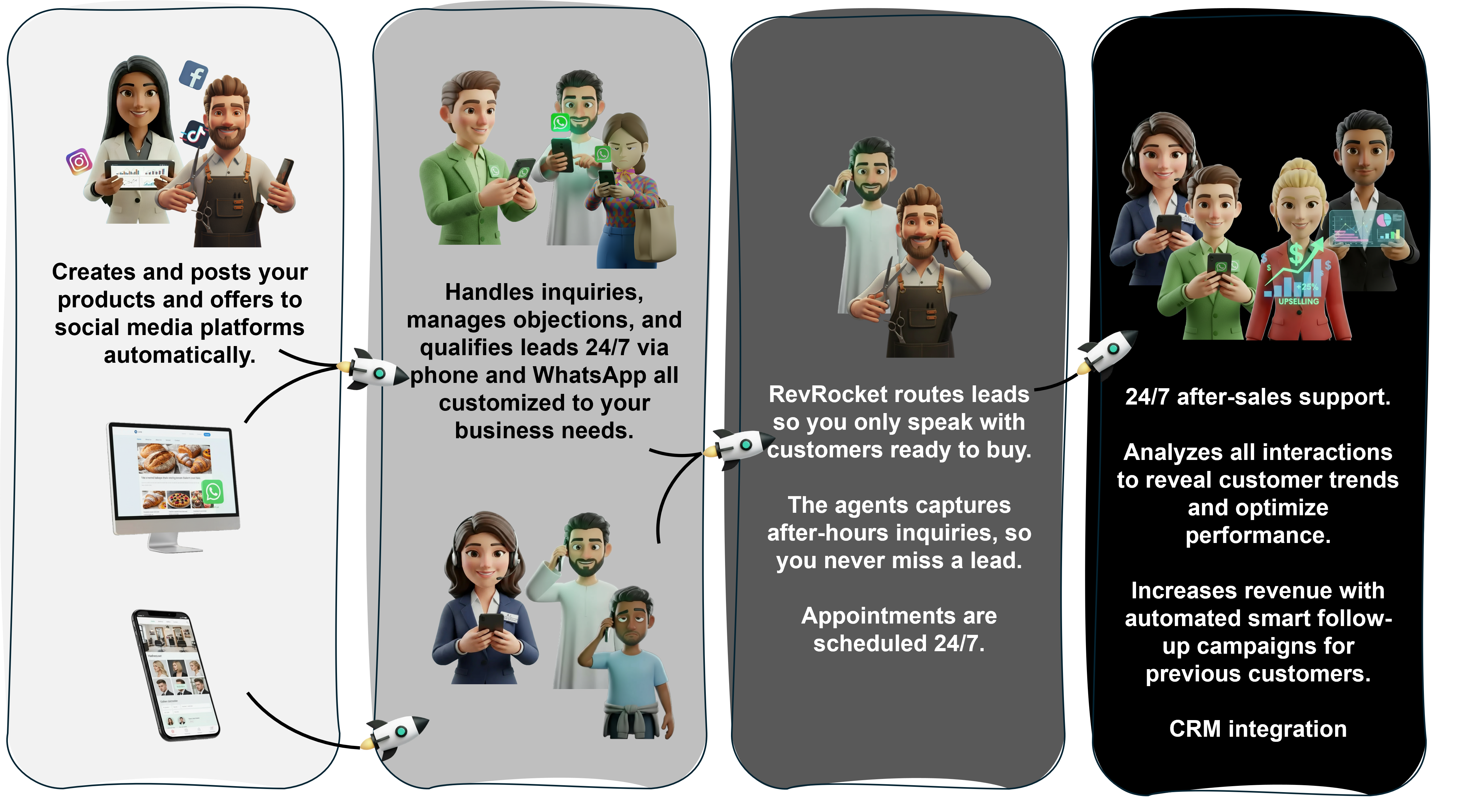 Rev Rocket handles your social media marketing, customer inquiries, objection handling, and lead qualification automatically so you only deal with customers ready to buy so you can focus more on your craft and what you love doing.
